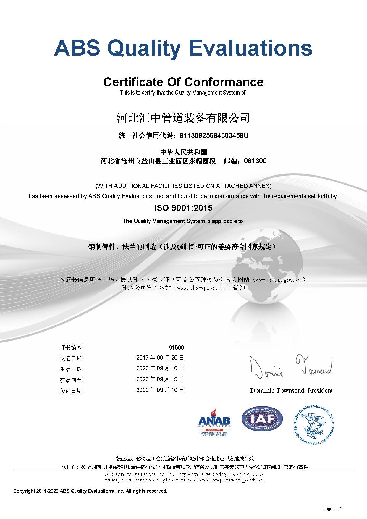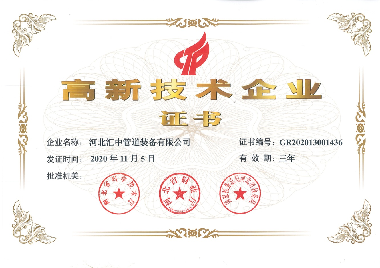 2020年11月5日,河北匯中管道裝備有限公司順利完成高新?lián)Q證,再次取得國(guó)家級(jí)高新技術(shù)企業(yè)證書(shū)。