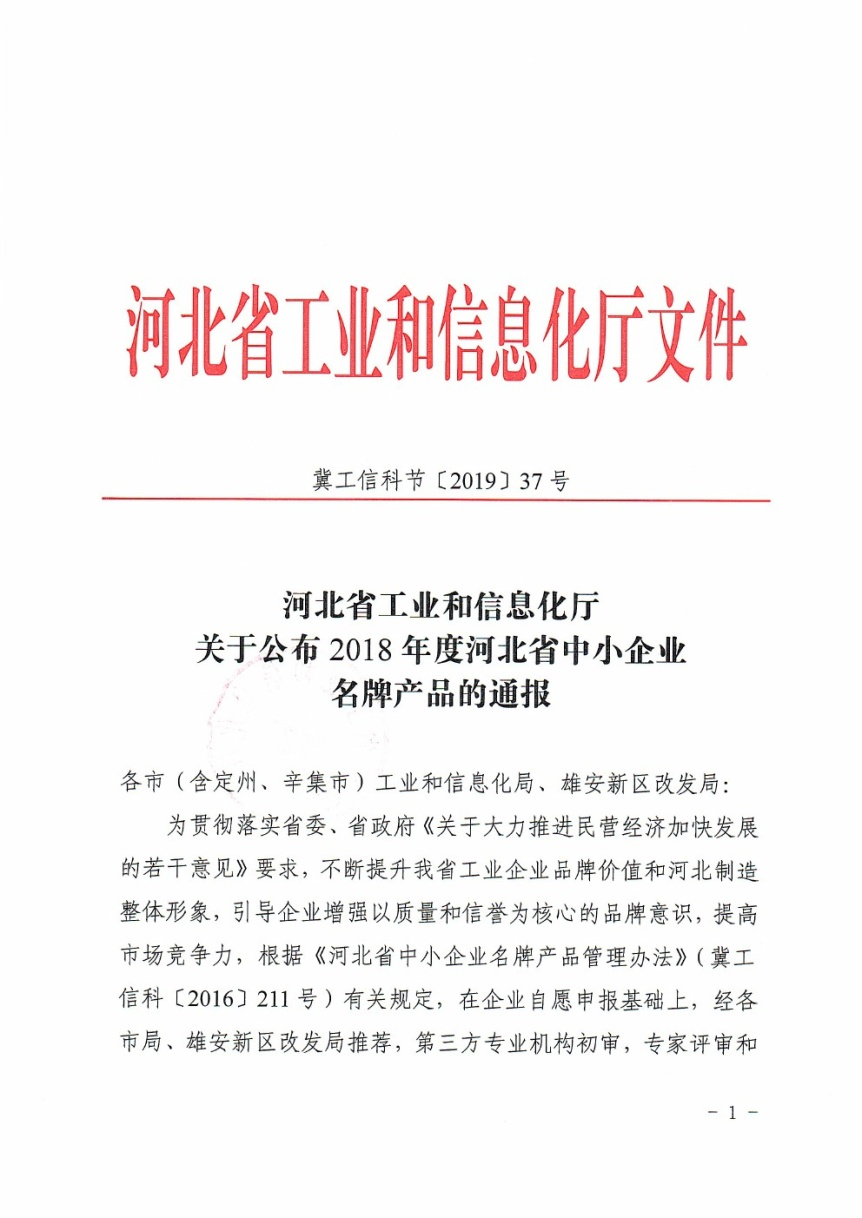 我公司獲評(píng)河北省中小企業(yè)名牌產(chǎn)品