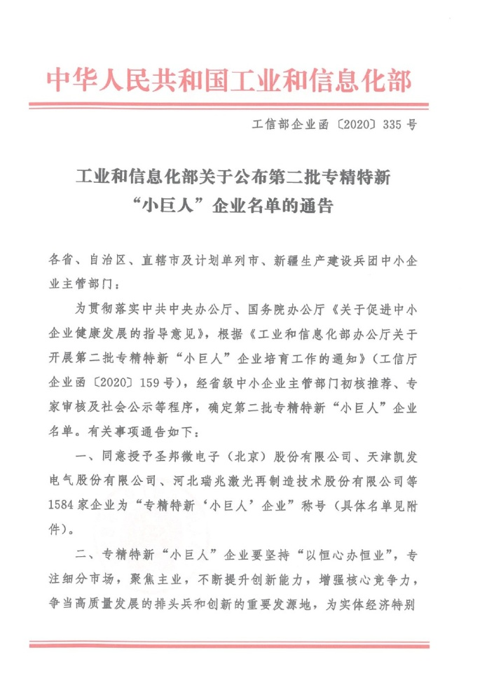 2020年12月11日,我公司被國(guó)家工業(yè)和信息化部認(rèn)定為第二批專精特新“小巨人”企業(yè)。